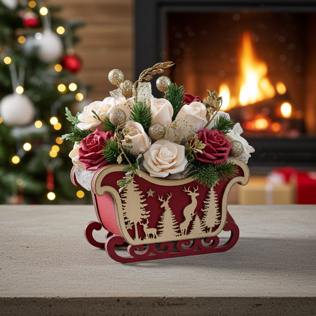 Μια εντυπωσιακή εορταστική δημιουργία με χειροποίητα τριαντάφυλλα από σαπούνι σε βαθύ κόκκινο και ιβουάρ αποχρώσεις, τοποθετημένα σε ξύλινο διακοσμητικό έλκηθρο με λεπτομέρειες δάσους. Ένα signature κομμάτι που δίνει αίσθηση πολυτέλειας και Χριστουγεννιάτικης ζεστασιάς.